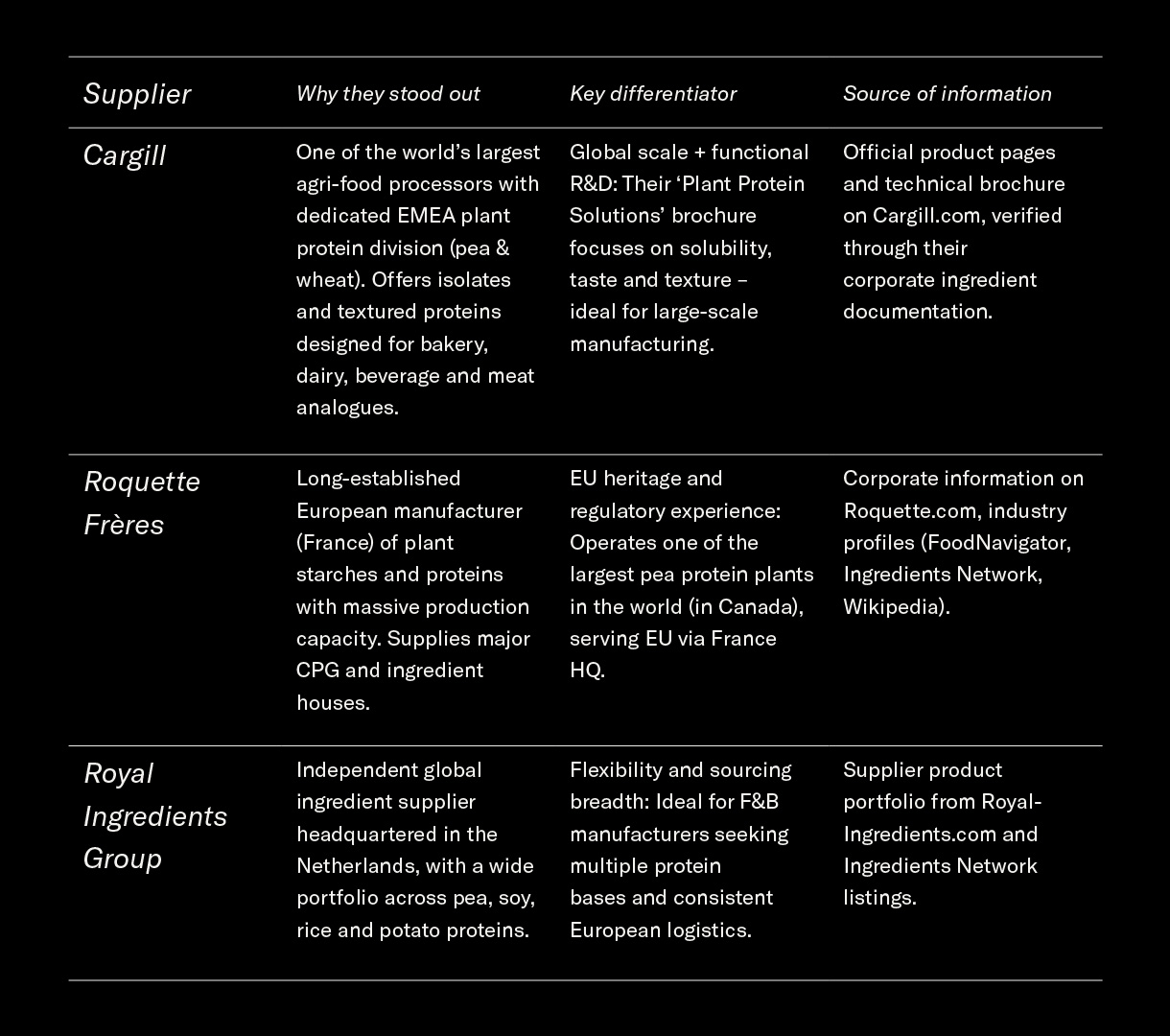 ‘FoodNavigator frequently highlights protein ingredient providers in articles on innovations, such as ADM’s SojaProtein soy offerings and Roquette’s pea facilities, aiding validation of large-scale capabilities. These complement market reports by offering real-world production updates and sustainability claims, though primary reliance stayed on direct supplier data and rankings for objectivity. It proves useful for emerging trends but secondary to comprehensive reports.’